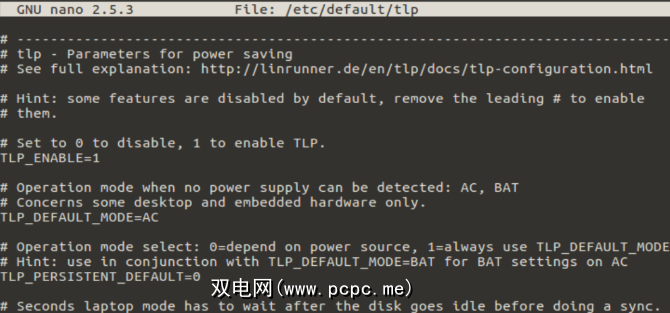 sudo nano /etc/default/tlp在TLP文档中可以找到很多设置,但是如果没有适当考虑,不应应用这些设置。实际上,更改一项设置,重新启动(需要进行更改)并查看该设置如何帮助或阻碍笔记本电脑的电池是最安全的做法。请注意,由于笔记本电脑之间存在许多差异,因此对您有用的东西可能对您的朋友不起作用。