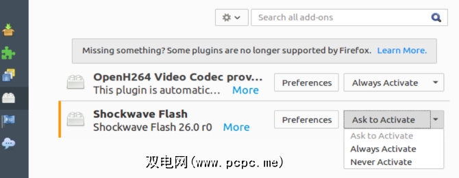 如果您使用的是Mozilla Firefox,请打开菜单,然后选择插件>插件。在这里,将Shockwave Flash设置为从不激活。或者,如果您希望不时需要Flash,请使用要求激活选项。这样,在加载视频后,系统会提示您启用Flash,然后再播放。