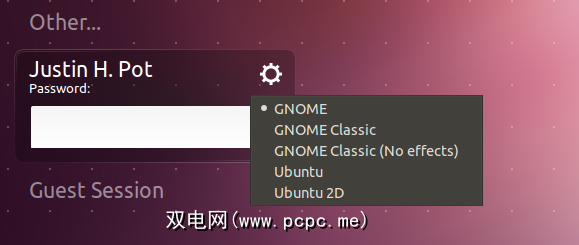 是否要尝试Gnome Shell?注销Unity进入登录屏幕。在那里,在登录之前,单击输入字段旁边的齿轮图标: