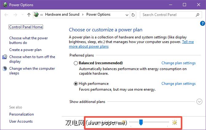 通过打开菜单来启动电源选项。开始菜单,然后搜索“电源选项"。在底部的底部,使用屏幕亮度滑块进行相应的调整。