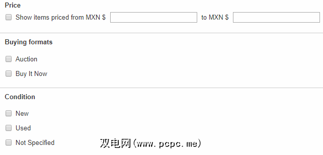 购买格式: eBay为人们销售产品提供了两种不同的方式:拍卖和“立即购买"。如果您只想查看两个类别之一的结果,则可以在其中应用过滤器。