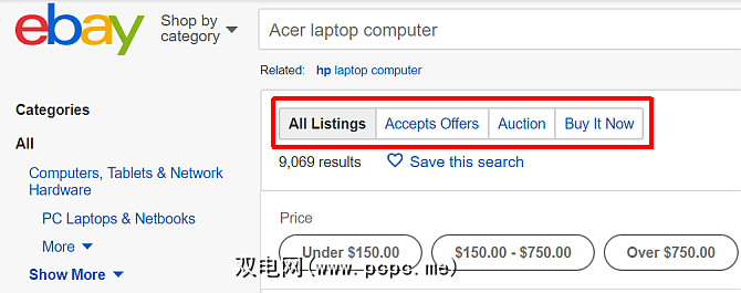 在搜索时对于您想要的内容,列表顶部具有选项,可以在列表类型之间进行切换。 “所有列表",“接受报价",“拍卖"或“立即购买"。