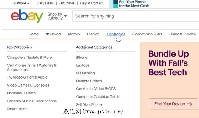 另一方面,eBay在线购物流程是为喜欢浏览商品,寻找特殊宝石的购物者量身定制的。买。它更细分为特定类别。您需要做的就是将鼠标悬停在任何主菜单项上,以查看有多少个子区域。