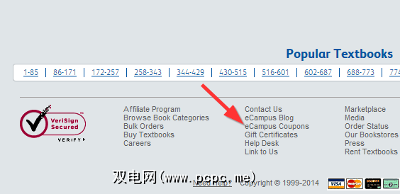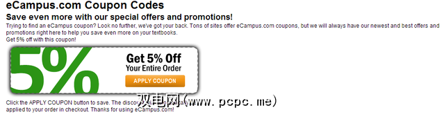 eCampus声称,尽管有一些网站和工具为其站点提供优惠券,但它们将始终拥有最新的优惠券,可为您节省最多的钱。关键是简单地查找并使用,很少有人这样做。首先向下滚动到页面的最底部。在第二行第三行的小文本中,您将看到“ eCampus优惠券",其中将为您提供上图所示的优惠券。