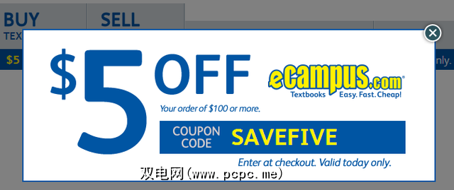 您通过使用eCampus而不是通过您的大学书店,您可能已经可以节省费用,但是eCampus提供了额外的优惠券,以提供额外的奖励。也就是说,您应该进行一些价格检查,以确保eCampus便宜,当然,请与其他学生确认是否可以从他们那里以相同的价格获得这本书。