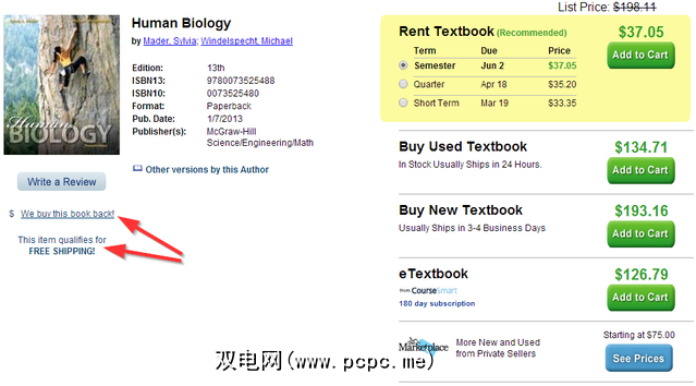 在页面的右侧(如上图所示),有租借板块(学期,季度,短期),二手货,新货,电子教科书版本和在Marketplace上购物,这是由eCampus提供支持的商店,允许您从第三方卖家那里购买教科书,通常价格低于eCampus列出的价格。