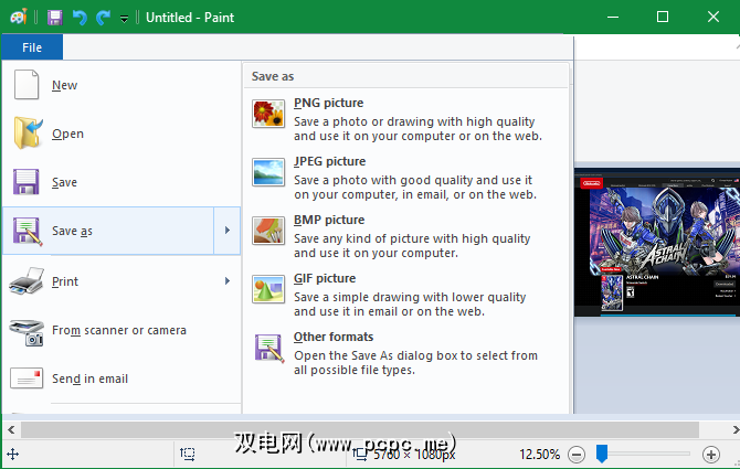 完成编辑后,最后一步就是保存屏幕截图。与大多数图像编辑器一样,“画图"为您提供了几种文件格式选项。