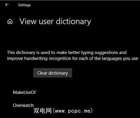 如果您想要一种更简单的方法来查看和删除已添加到拼写检查中的所有单词,请转头进入设置>隐私>语音,墨迹和打字。点击查看用户词典链接,您将看到所有条目。由于某些原因,您无法在此处删除单个项目,但可以单击清除字典来将其全部删除。