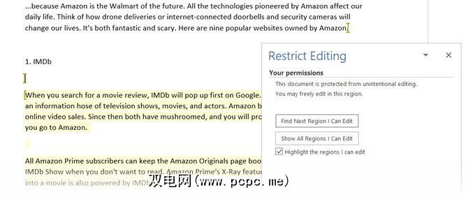 这将成为受限制的文档。当有人收到Word文件时,如果他们有权限可以对文档的特定部分进行更改。 限制编辑任务窗格具有导航按钮,可用于移动到它们有权更改的文档区域。