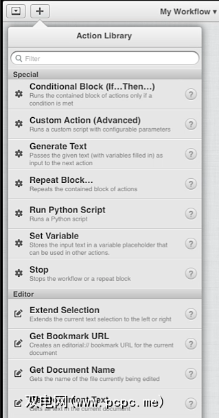您可以使用操作库中的选择构建自己的工作流程,其中包括数十种行动。其中包括选择文本,替换文本,请求文本输入,将所选文本的大小写更改为大写,小写或标题大小写,设置条件块(如果 x Then y )仅在满足特定条件或运行Python脚本时运行。