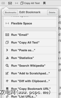 请注意,在菜单栏下方,有一个类似的浏览器栏到Safari中的那个。在此空间中,您可以添加内置操作,例如用于复制文档中所有文本,将文档附加到电子邮件,在Wikipedia中搜索选定单词,打开输入URL面板等的快捷方式。您还可以构建类似的书签操作以将其添加到书签栏。