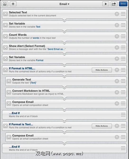 Editorial包括一整套工作流程,如您在上面的屏幕快照中所见。如果点击工作流程的向右箭头,则可以查看组成该工作流程的所有操作。这些操作是按顺序执行的,类似于Keyboard Maestro和Automator中的操作。