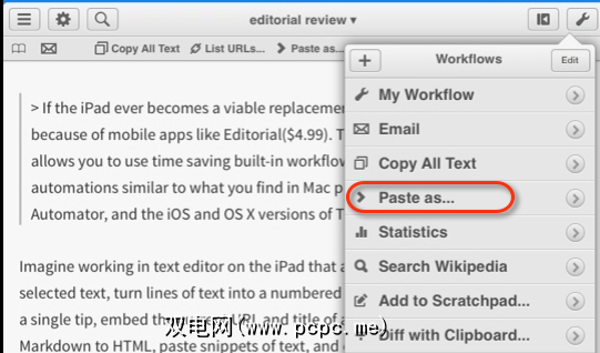 如果iPad成为笔记本电脑的可行替代品,则可能是因为社论($ 4.99)等移动应用程序的缘故。使用此文本和Markdown编辑器,您可以使用节省时间的内置工作流以及自定义自己的自动化功能,类似于在Mac程序(如Keyboard Maestro)和iOS和OS X应用程序TextExpander中找到的功能。