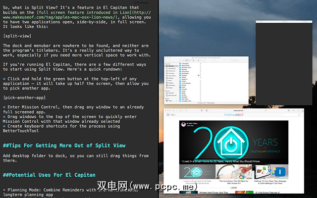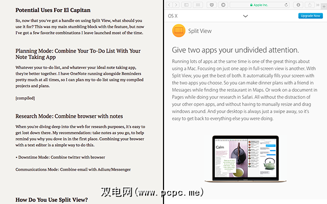 那么,拆分视图是什么?这是El Capitan的一项功能,它建立在Lion中引入的全屏功能的基础上,使您可以全屏并排打开两个应用程序。看起来像这样: