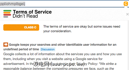 另一个是“服务条款,未读"。这是一个浏览器扩展程序,可扫描您要注册的网站和软件的服务条款(您声称已阅读的网站和软件,但实际上,您不会被打扰)。然后,它将对ToS进行评分,并告诉您其中是否需要知道一些危险信号。