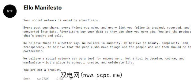Ello并没有显示出对《 Ello宣言》的反感。他们的无广告和支持隐私的精神。尽管他们的发行遇到了麻烦,有争议的风险资本涌入以及缺乏货币化策略,但他们还是坚持不懈。