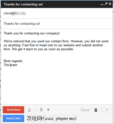 多次发送同一封电子邮件:您是否在eBay,亚马逊或类似网站上销售商品?使用罐头回应描述您的产品,或通知买家售罄的产品。是否需要向多个客户发送合同,问题或详细信息?可以那些电子邮件。是否需要以相同的方式回复多封电子邮件?这是罐装响应的完美用法。不必每次都从头开始输入这些电子邮件,或者从旧电子邮件中复制和粘贴,而只需保存一个罐头答复即可。这是经典用法。
