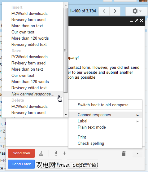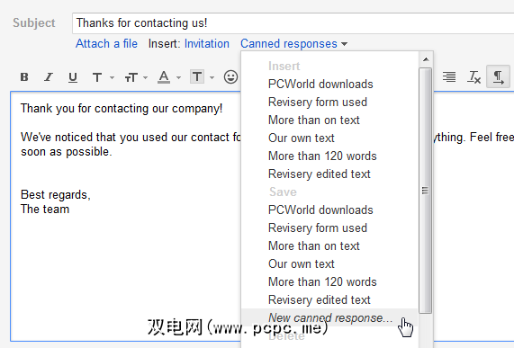 恭喜!您现在有了一个新的罐头响应。随着您不断添加它们,您会看到列表越来越长。不过,请确保您不要感到困惑。该列表显示在三个标题下:插入,保存和删除。第一个和第三个是不言自明的,但是如果您在 Save 菜单下选择其中一个答复,则将用电子邮件草稿中当前包含的内容覆盖它。
