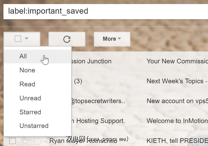 这听起来像是一件琐事,但是一次目视扫描一页电子邮件只会发现您实际上想要保留的几封电子邮件。然后,您可以选择该页面上的所有电子邮件并将其全部删除。这将一次清除50封左右的电子邮件。