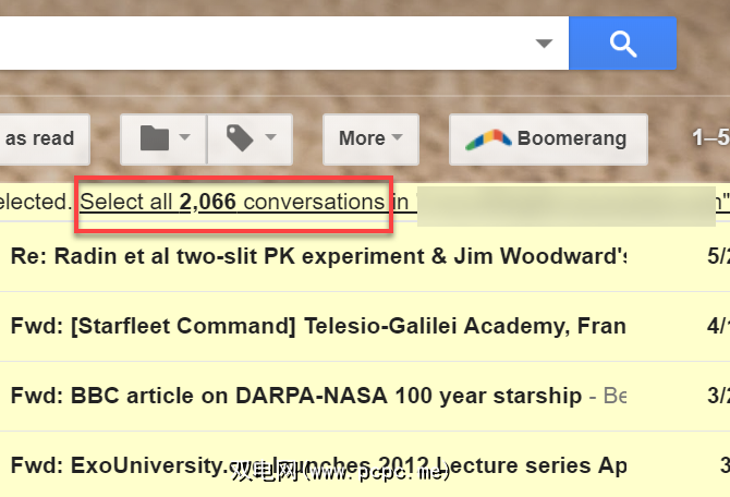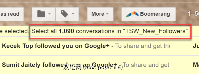 一旦您取消订阅的次数最多常用电子邮件,再次单击顶部的全选图标,然后单击顶部的“选择所有对话"链接。