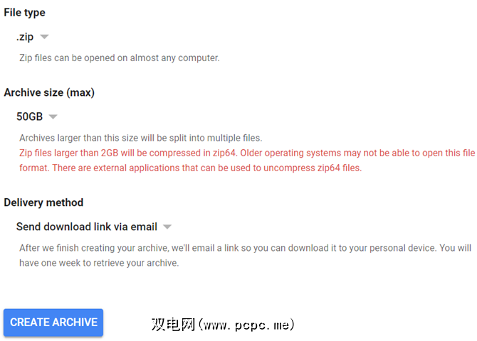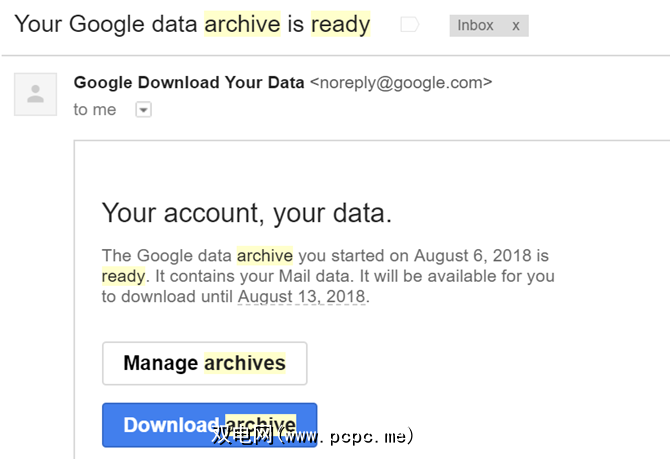 Google会通过电子邮件向您发送电子邮件,告知您已开始获取您的存档。可能需要几个小时甚至一天的时间,但是最终,当归档文件准备好下载时,您会收到一封后续电子邮件。下载链接将直接显示在电子邮件中。