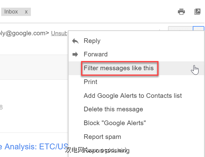记住,每当发现重复发件人出现时,请打开电子邮件,然后单击“回复"按钮旁边的下拉箭头。从此列表中单击“过滤此类邮件"。