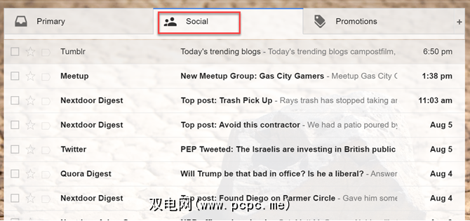 如果您使用的是Google默认样式的Gmail收件箱,则您会看到社交和促销标签在收件箱顶部。