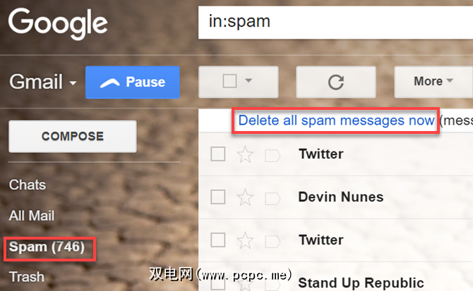 下一步,继续处理Gmail垃圾邮件。在导航字段中,单击垃圾邮件链接,然后单击“立即删除所有垃圾邮件"。