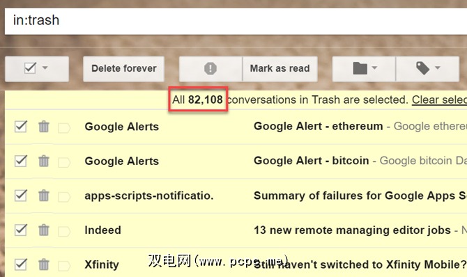 点击垃圾 >在左侧导航栏中,单击邮件列表顶部的“全选"框,然后单击第一封电子邮件之前列出的“所有对话"链接。