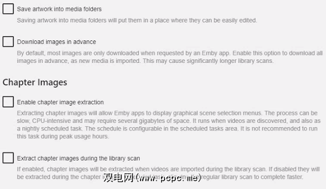 例如,当您在Emby上创建电影库时,您会看到高级选项,例如是否启用章节图像提取以及是否提前下载元数据图像。
