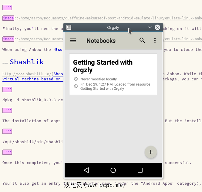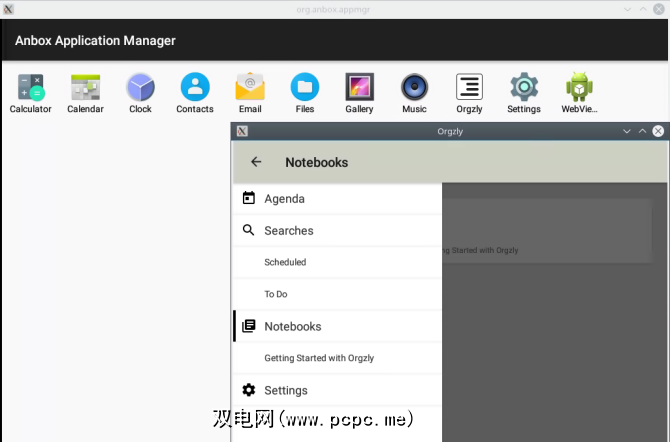 最后,您会在Anbox窗口中看到该应用程序的图标弹出。点击它会打开您想要的应用程序(下图显示了我们在上方安装的Orgzly应用程序):