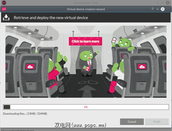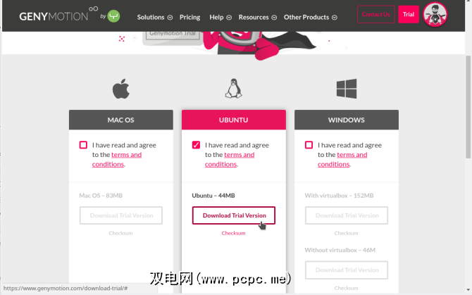 重新登录帐户后,单击右上角的“试用"按钮页面。它将带您到下载页面,您可以在其中为系统选择Genymotion的版本。下载此文件时,还应确保已安装VirtualBox,因为Genymotion使用了它。