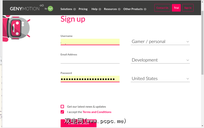 首先,它是一种商业产品,因此,如果要长期使用它,则需要将其小马化。现金。这也意味着您需要拥有Genymotion帐户才能下载试用版。最后,它被定位为开发人员工具,这意味着它并不是真正的启动应用程序的便捷方式,而是完全可用于测试的系统。如果没有上述任何一项,可以先填写一个简单的表格并注册一个帐户: