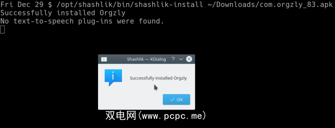 /opt/shashlik/bin/shashlik-install name_of_app_file.apk完成后,您会看到一个漂亮的小弹出窗口,表示安装成功。