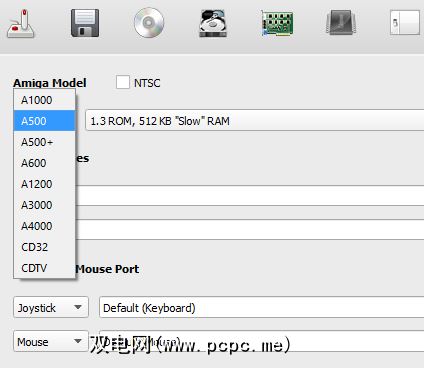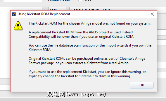 您还需要选择Kickstart ROM。 Kickstart是引导固件,它为Amiga准备了从插入的软盘上运行软件的准备。发行了各种版本的Kickstart。
