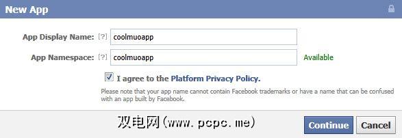 这是接下来要显示的框。只需将您想要的任何内容放入两个框中即可。没关系,只要其他人没有保留该名称即可。长度也应至少为7个字符。如您所见,我把“ coolmuoapp "放在脑海中。现在,点击“ 继续"。