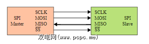 某些设备可以通过“菊花链式"共享一个SS引脚,从而保持使用的总引脚数减少到四个,再加上两个用于电源和地。 SPI以极快的速度而闻名,通常用于移位寄存器或ADC(模拟到数字转换器)以在设备之间传递数据。