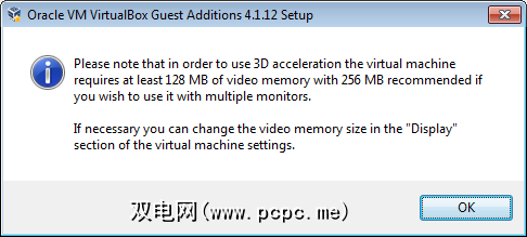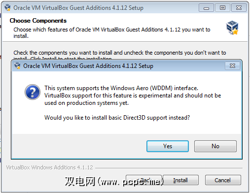 上面的步骤很关键。请注意, Direct3D支持默认情况下处于关闭状态。您必须选中此框,本教程才能起作用。完成操作后,VirtualBox Guest Additions会立即告诉您,您在Aero方面是正确的: