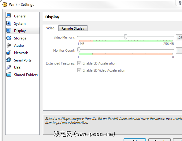 在重新引导VM时,让我们确保我们有足够的显示内存供Aero使用。单击“计算机">“设置",然后显示: