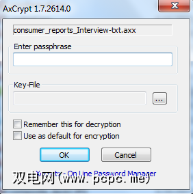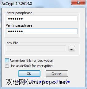 如果要将敏感信息发送给通常不与之交流的人,这是完美的选择,例如他们可能没有安装AxCrypt。他们需要正确的密码来解密文件。在接收端,当用户尝试打开文件时,将打开相同的屏幕–总是要求输入密码和密钥文件。如果仅在加密文件时设置密码,则用户只需输入该密码即可。如果您还创建了密钥文件,那么他们也需要浏览该文件,否则他们将无法解密。