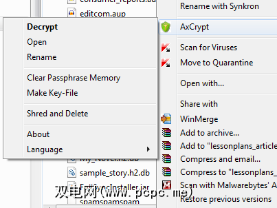 在接收者端,如果该人已经安装了AxCrypt,解密文件就很简单单击文件,然后单击“解密"。 AxCrypt识别文件是否已加密,并将相应地更改上下文菜单。收件人还可以在阅读完接收到的文件后对其进行完整的“粉碎和删除"操作,这样就不会在任何地方保留文件记录。