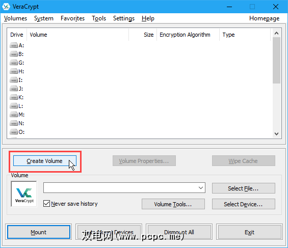 要创建VeraCrypt卷,请打开VeraCrypt,然后单击创建卷。