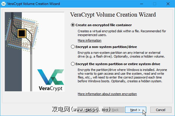 在 VeraCrypt卷创建向导上,选择要创建的卷的类型。我们将创建一个加密卷来存储私人文件,因此我们接受默认选项创建加密文件容器。