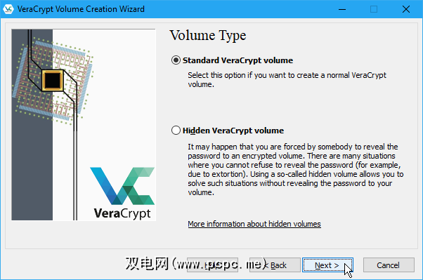 如果您担心自己可能会被迫有人透露您的密码,您也可以选择创建一个隐藏的VeraCrypt卷。通过单击有关隐藏卷的详细信息链接来了解有关隐藏卷的更多信息。