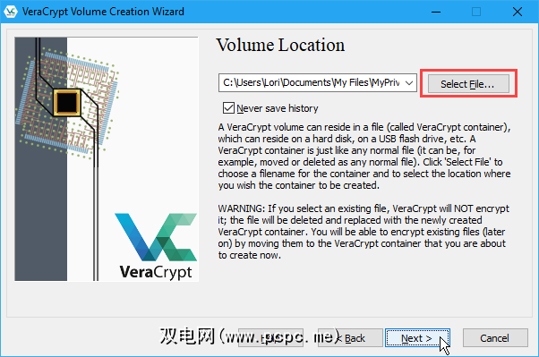 在<在“卷位置" 屏幕上,点击选择文件。然后,使用“指定路径和文件名" 对话框输入名称并选择VeraCrypt卷文件的位置。