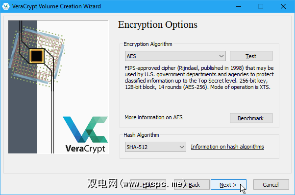 在加密选项屏幕上,选择加密算法和哈希算法。如果不确定使用哪种算法,这两种方法的默认算法都是安全选项。