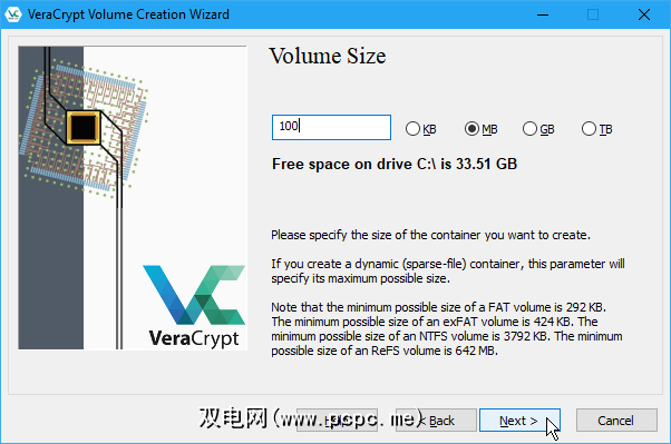 输入所需的大小在编辑框中选择VeraCrypt卷,然后选择该大小为 KB , MB , GB 或 TB 。