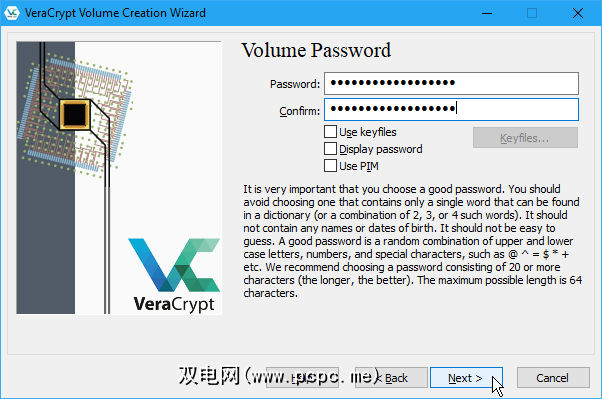 密钥文件为您的卷增加了额外的保护。对于我们的示例,我们不会使用密钥文件,但是如果您决定使用密钥文件,则可以在VeraCrypt的帮助中阅读有关密钥文件的更多信息。