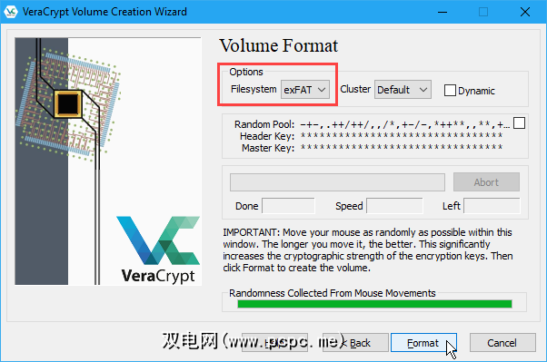 在 Volume Format 屏幕上随机移动鼠标,直到从鼠标移动中收集到的随机性至少变成绿色。但是,鼠标移动得越多,卷上的加密就越牢固。