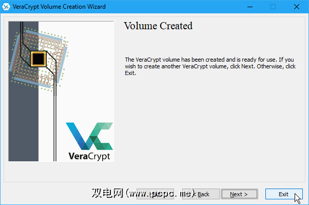 在 VeraCrypt卷创建向导对话框上,如果要创建另一个卷,请单击下一步。或单击退出关闭向导。